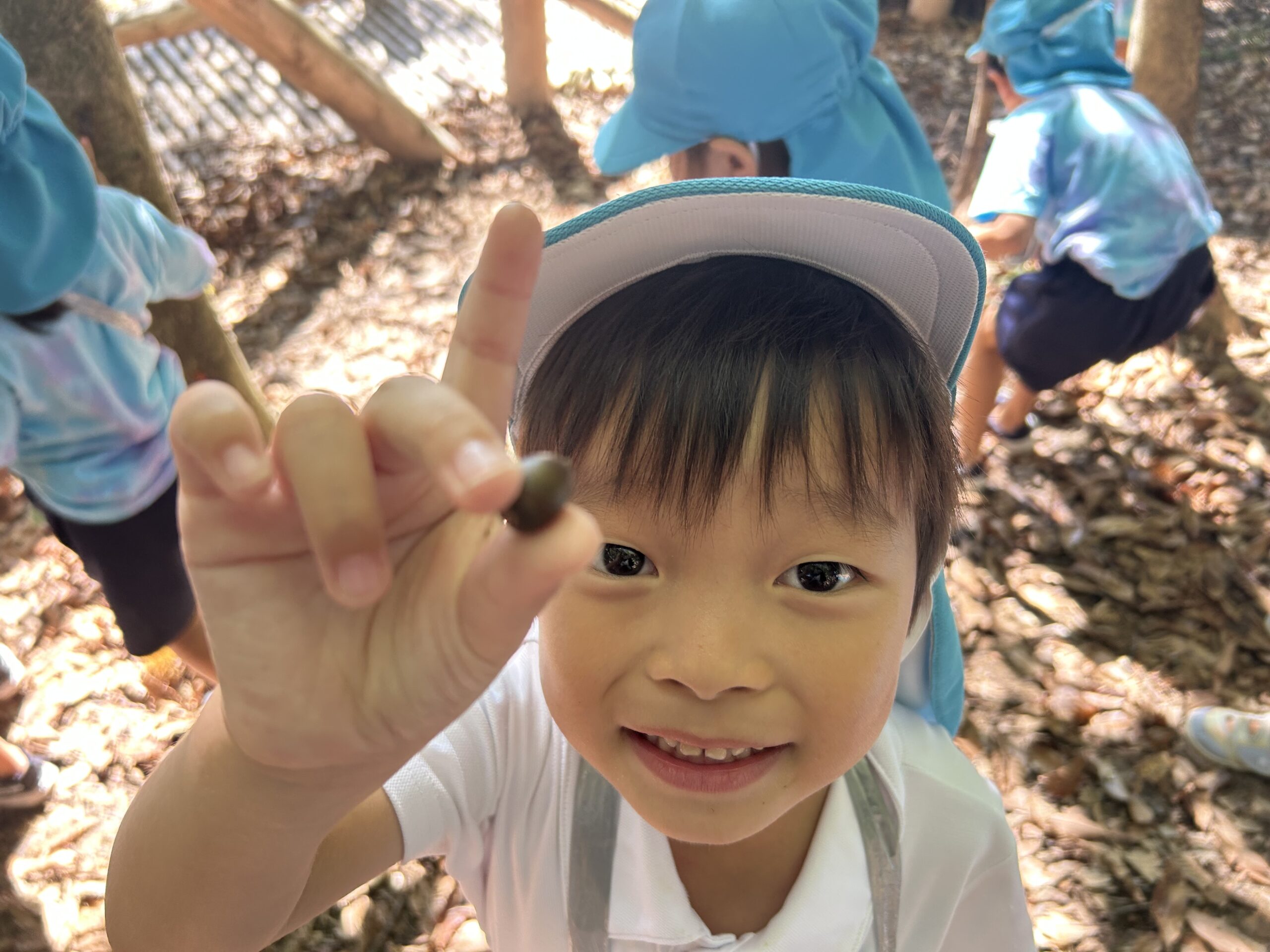 今日は、年中組みんなでアスレチックの森へ遊びに行きました。 アスレチックの森には、いろいろな形のどんぐり、赤や黄色に色づいた落ち葉、栗などがあり、秋の訪れを感じることができました。子どもたちは、「赤ちゃんどんぐりを見つ […]