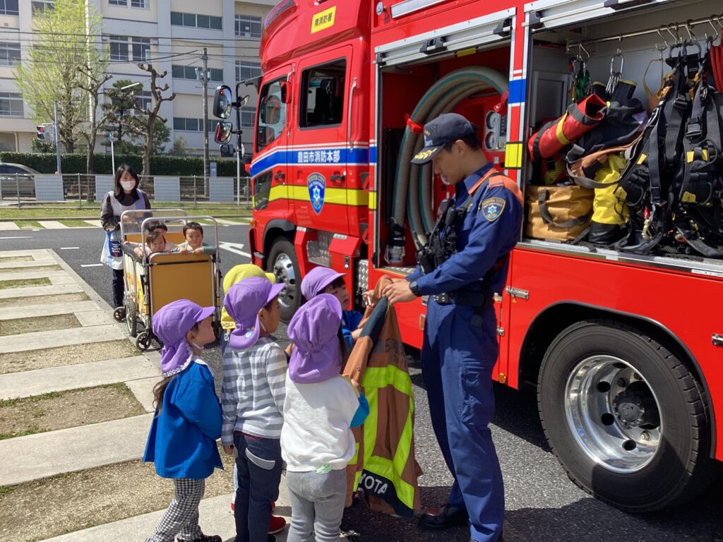 消防服を触らせてもらったり、消防車の中を見せてもらったりしました