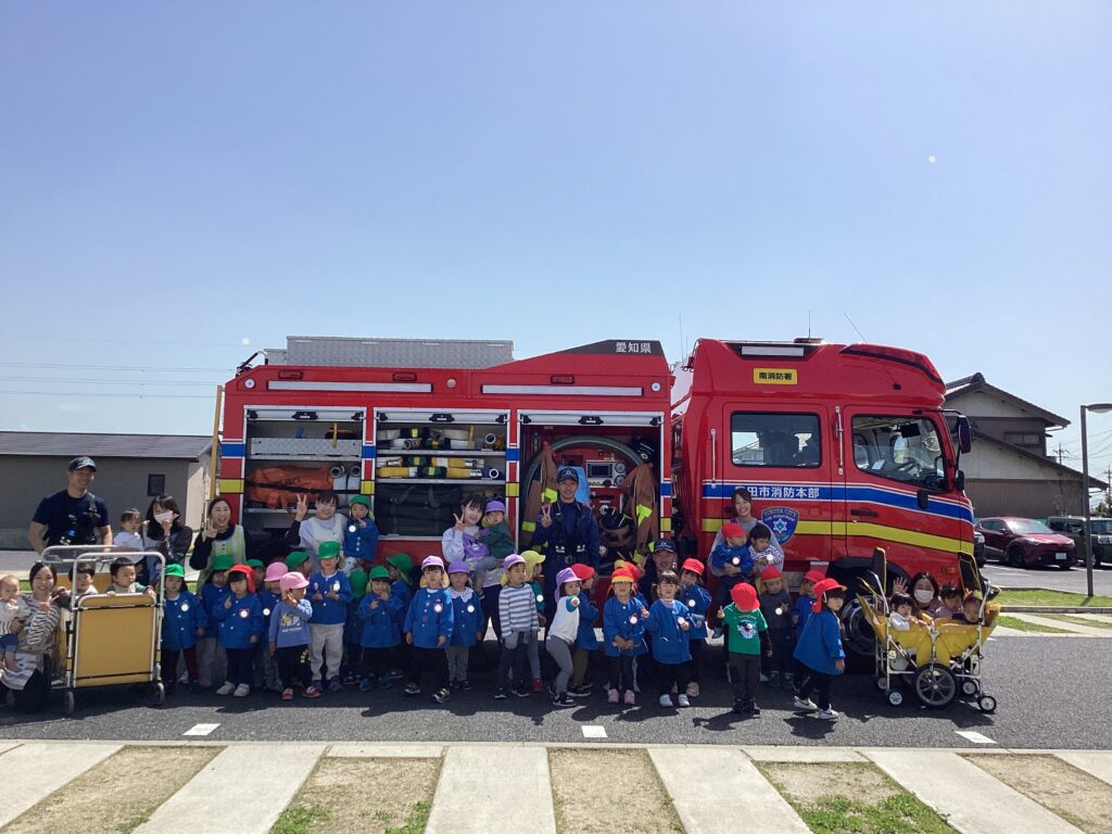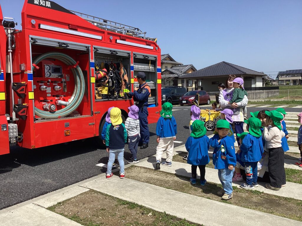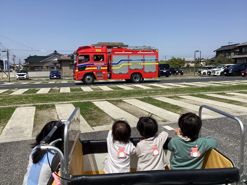 子ども達が外で遊んでいると、「駐車場をお借りします」と突然消防車がやってきました!