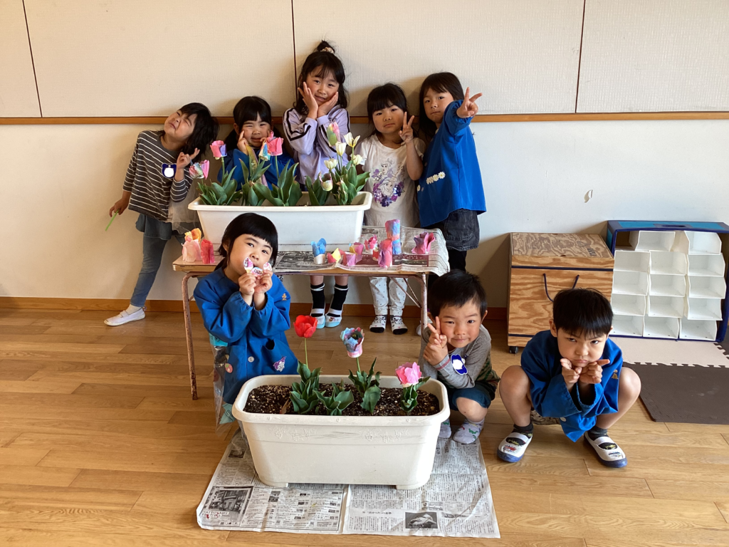 年長さんが昨年度植えたチューリップの球根が大きくなり、綺麗な花を咲かせました。