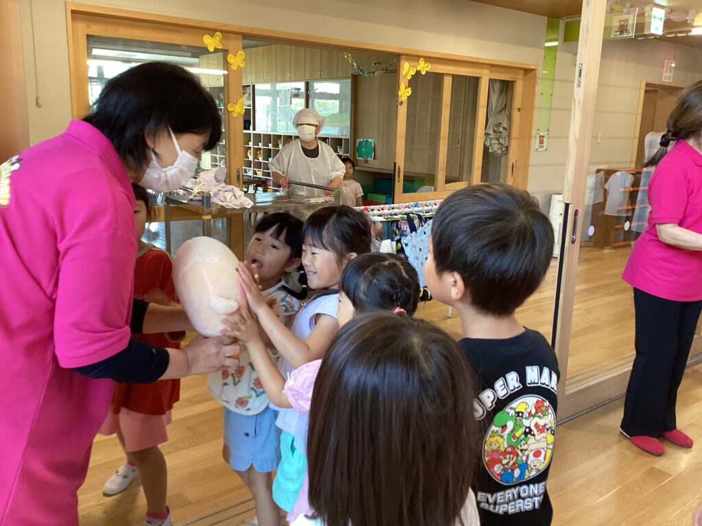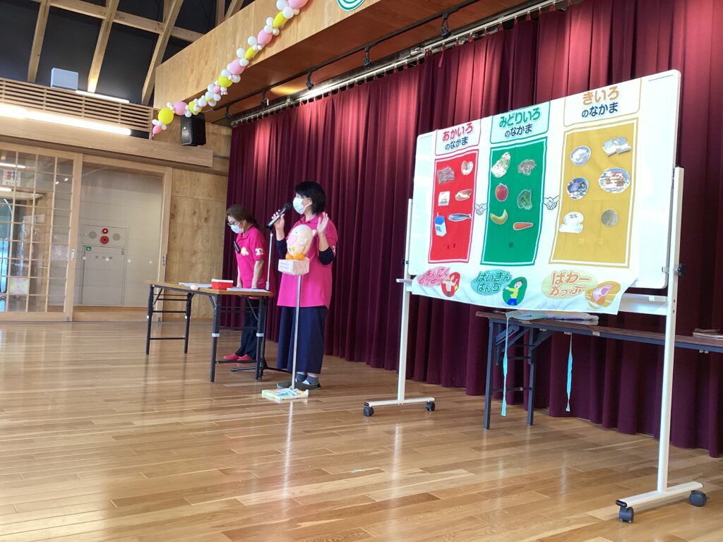 誕生会が終わると”たべまる”というかわいいお友達がやってきてくれ、たべまると一緒に食育(栄養)の話を聞きました。