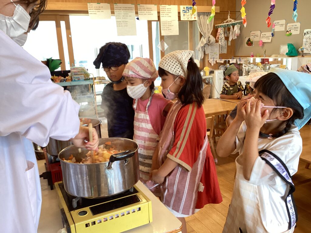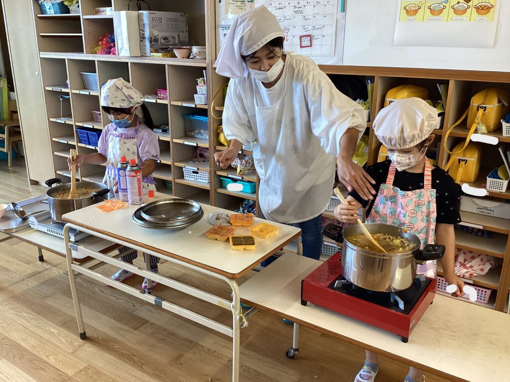 鍋に材料を入れて、グツグツ煮込んでいくと「いいにおいがする~」と嬉しそうな声が聞こえてきました♪