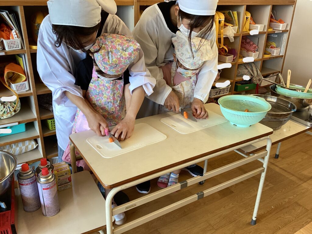 包丁も初体験。保育者と「猫の手だよ」と確認しながら、真剣な表情でにんじんやじゃがいもを切る姿が印象的でした★