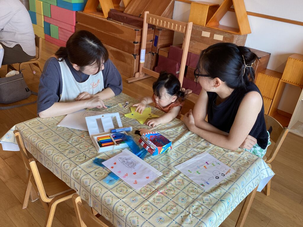 お母さんと一緒にシールをぺたぺた貼ったり、クレヨンで好きな色を塗ったり…