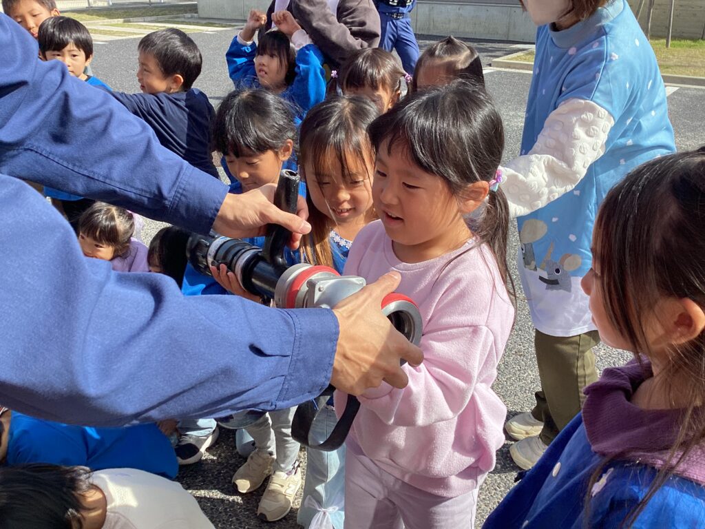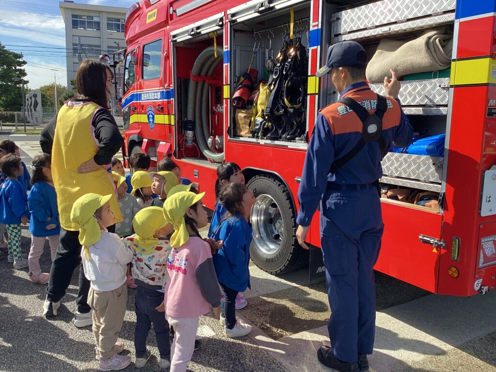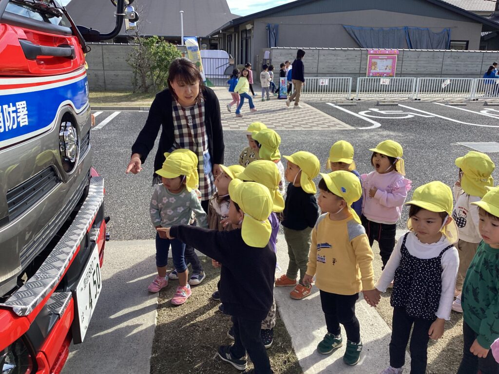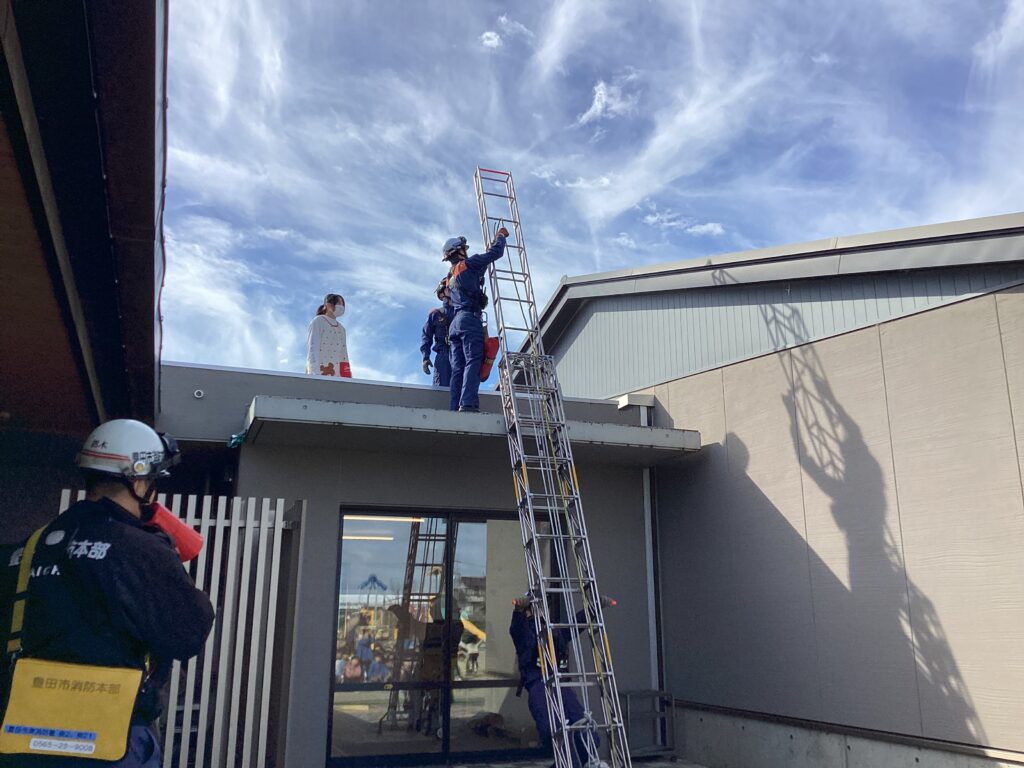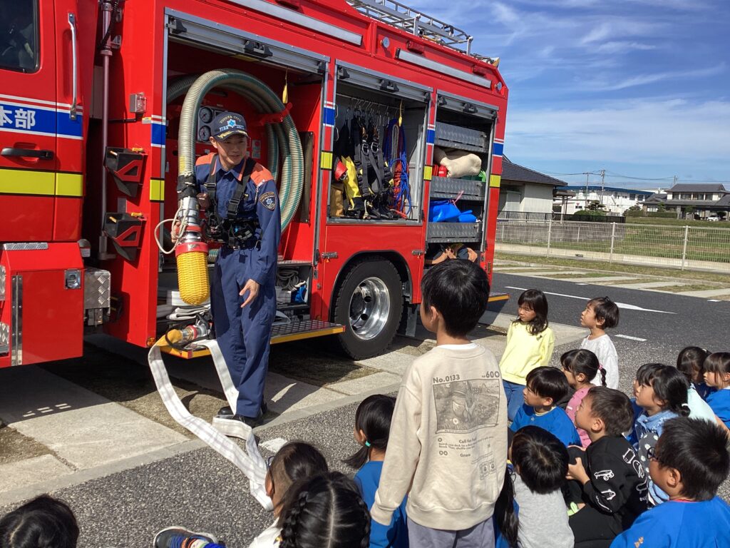避難訓練の後に保育者が消火器を使って消火する様子を見たり、屋根の上から降りられなくなった保育者を消防士の方が救助する様子を見たりしました。