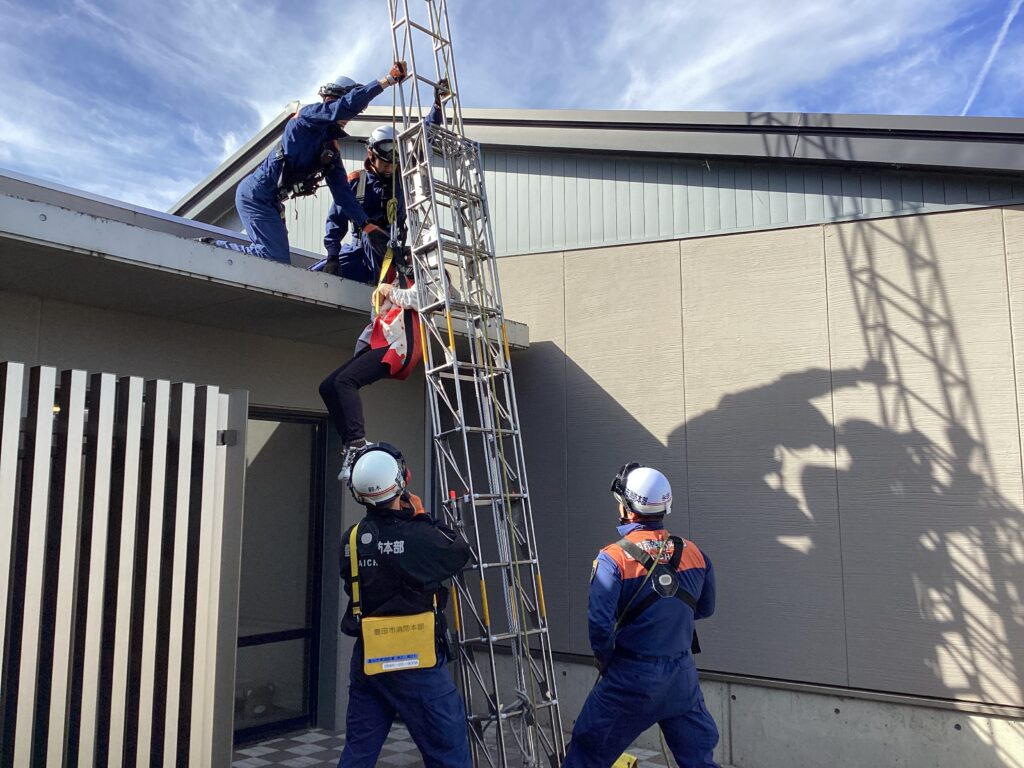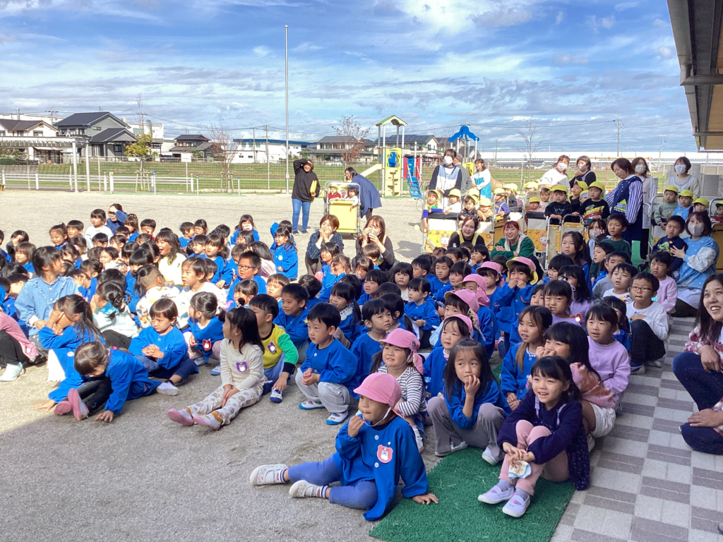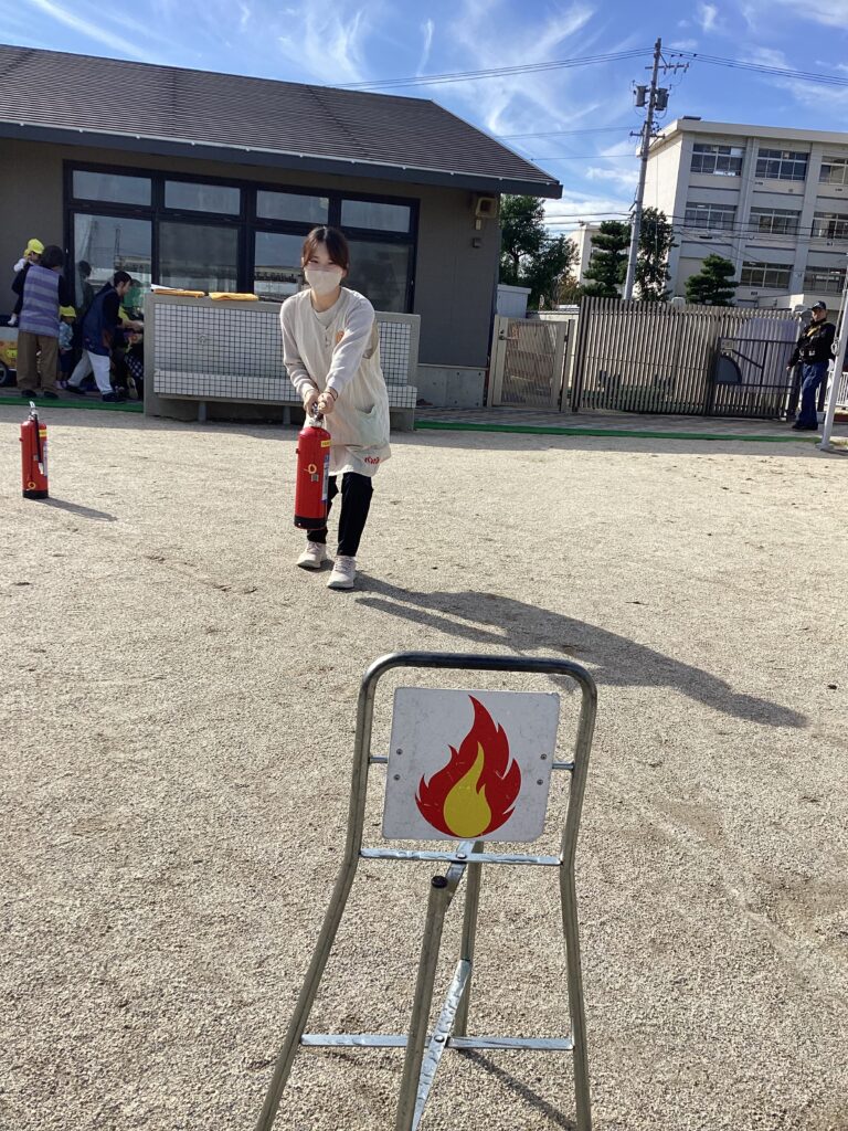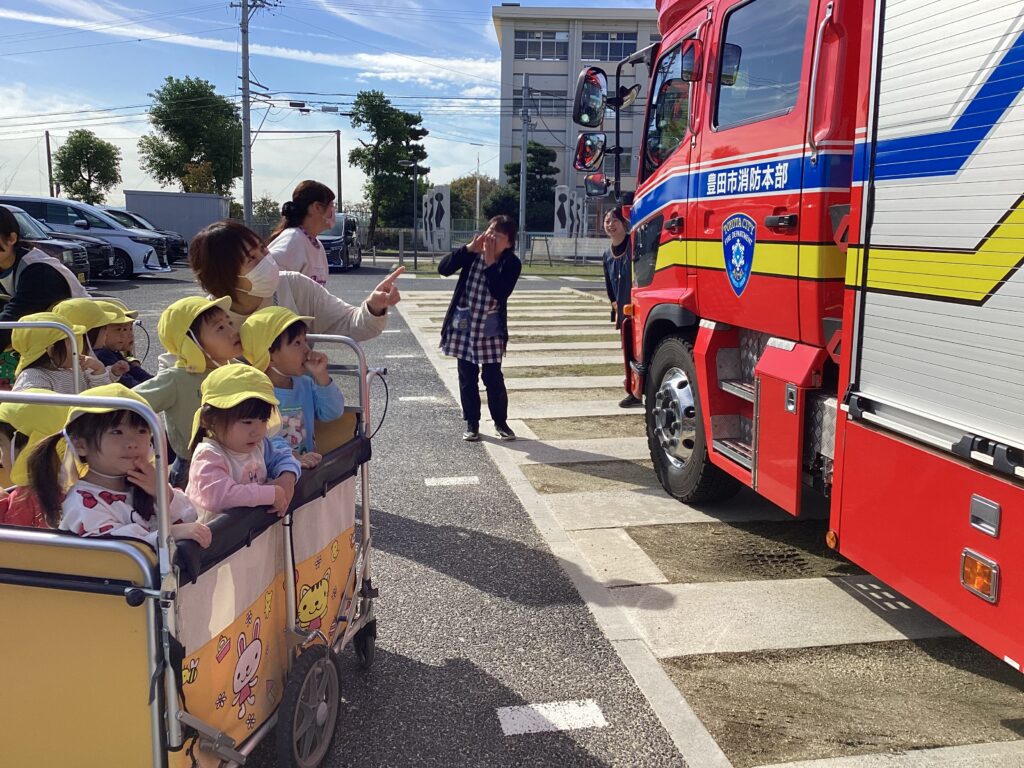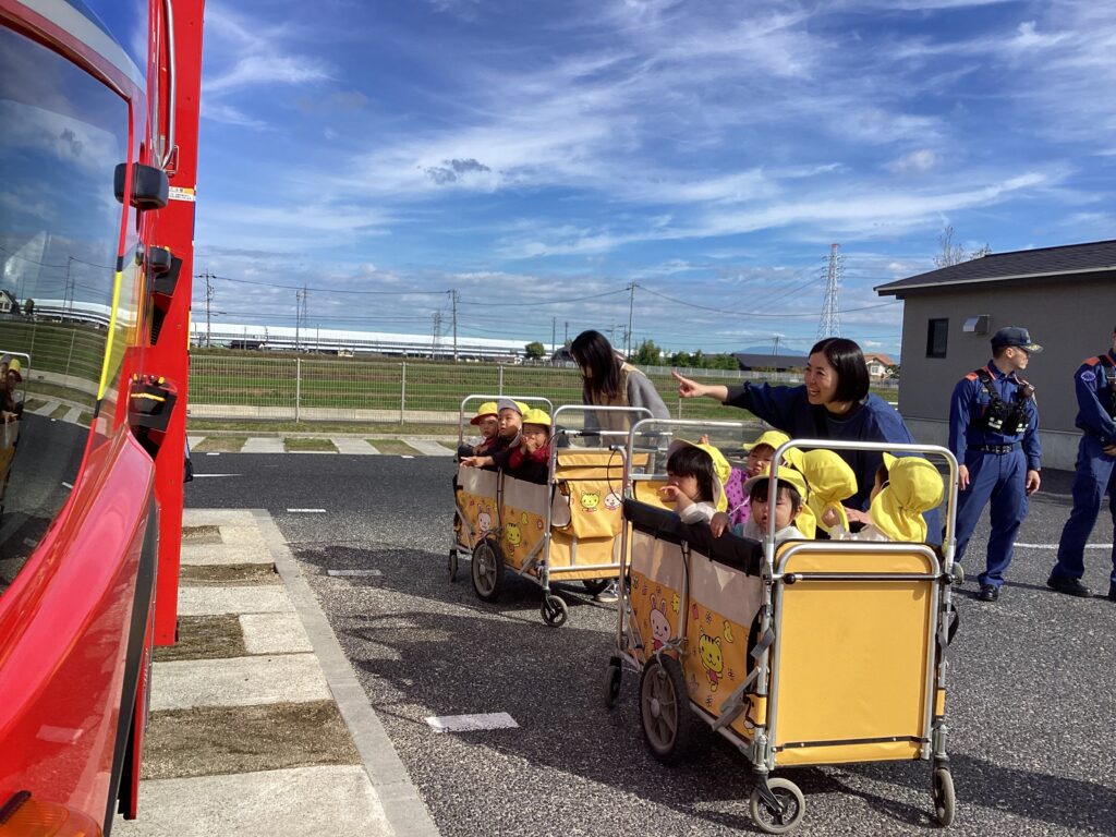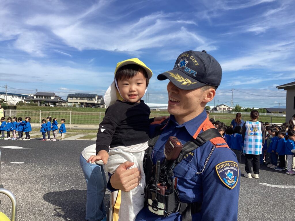 避難訓練の後に保育者が消火器を使って消火する様子を見たり、屋根の上から降りられなくなった保育者を消防士の方が救助する様子を見たりしました。