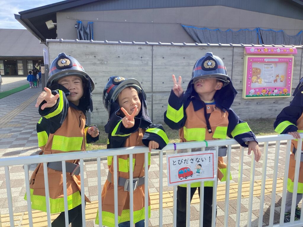 年長組は、救急服・レンジャー服・防火衣を着せてもらい、消防士になりきる子もいました✨
