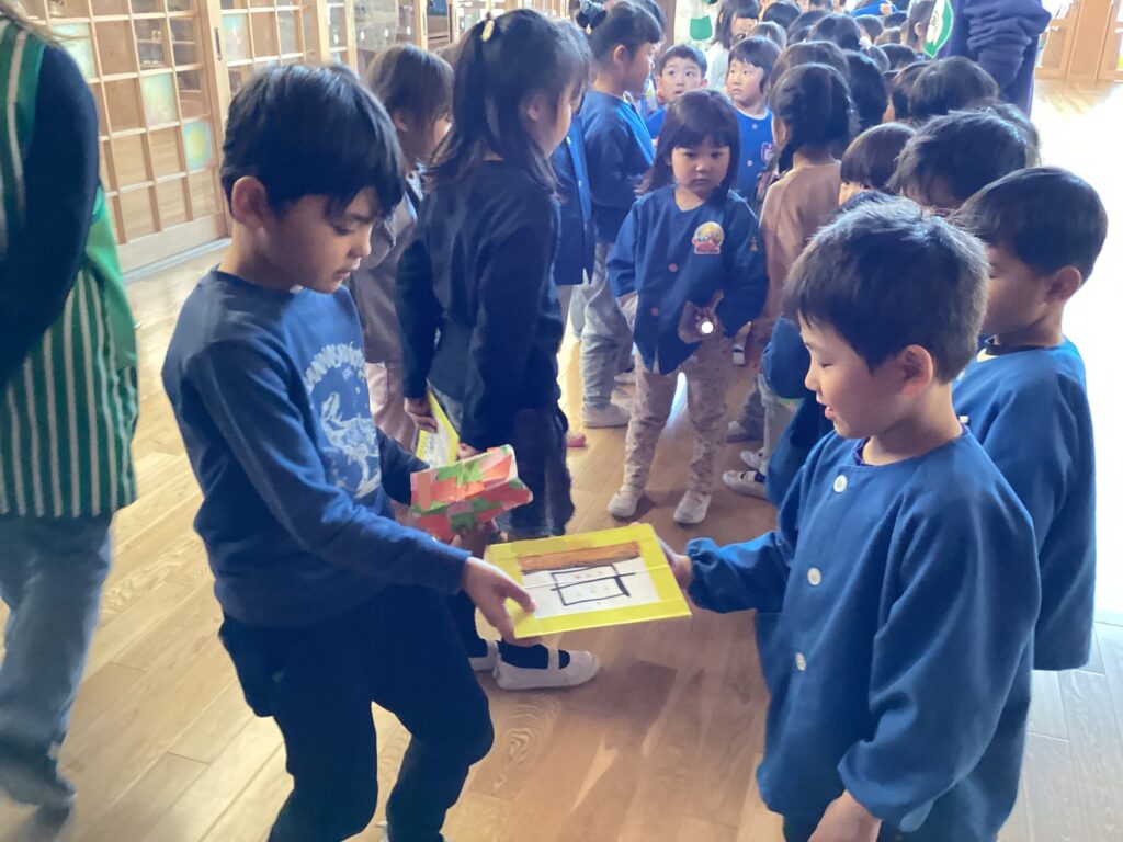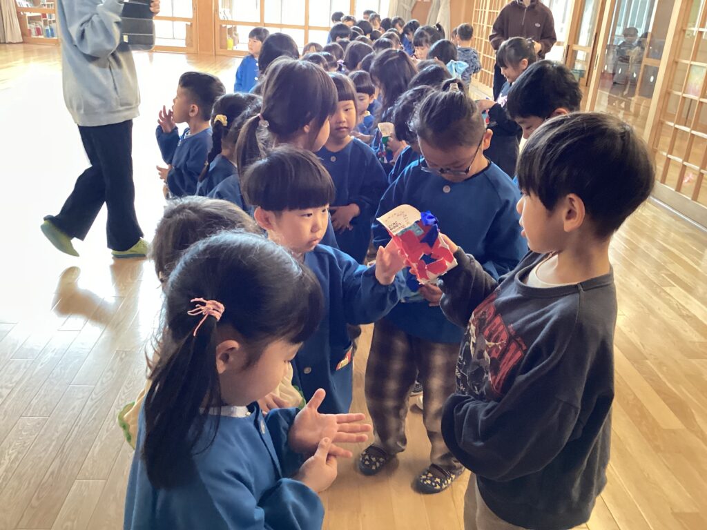 プレゼント交換です🎁年少・年中組からペン立てを渡しました😊