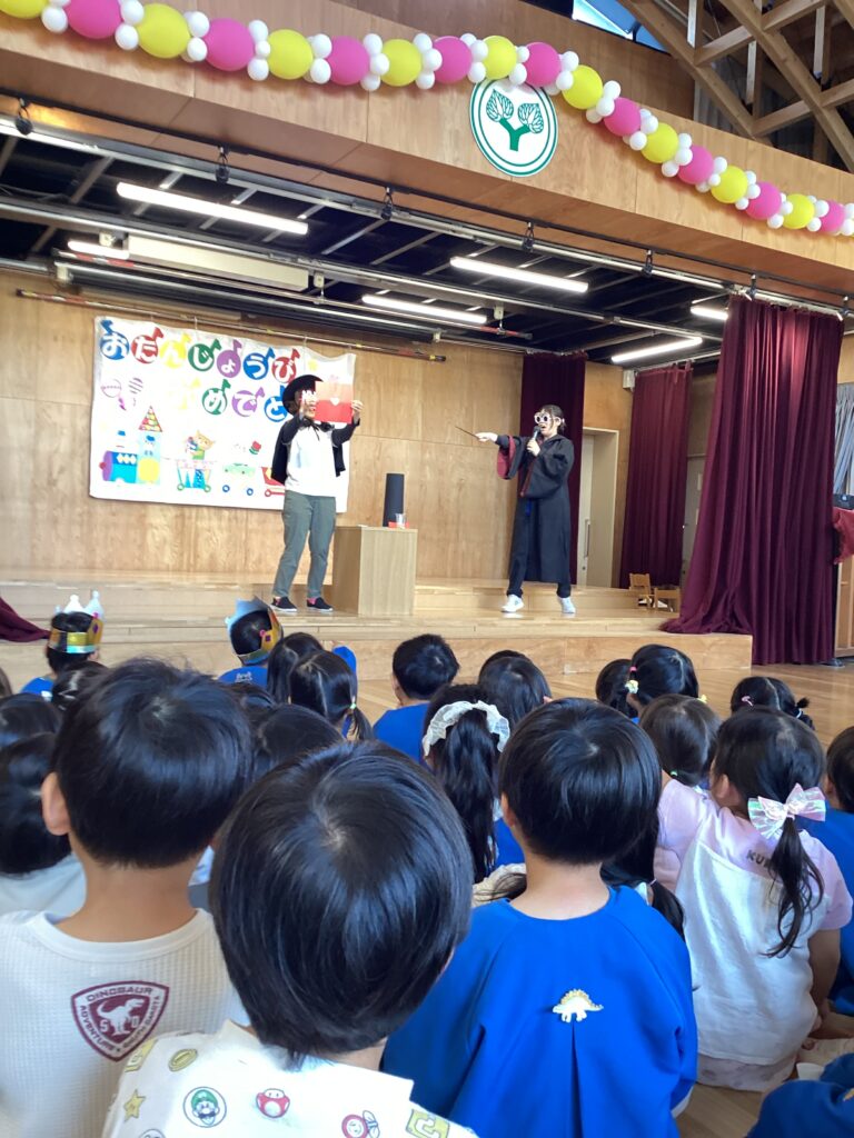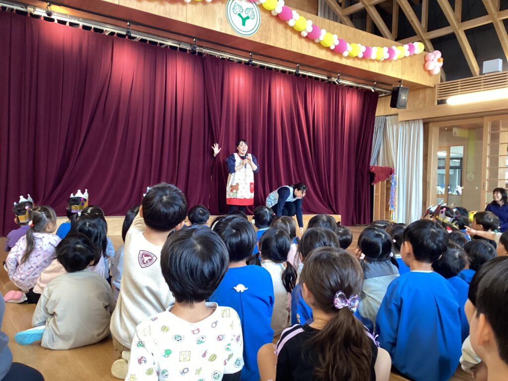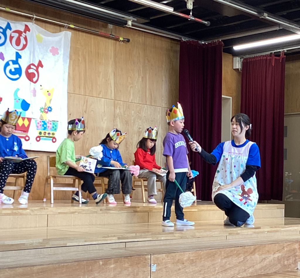 ドキドキしながらも、マイクで名前や好きな遊びなどを答え、園長先生から誕生日絵本のプレゼントをもらいました。どの子も嬉しくて、すぐに絵本を広げて見ていました。