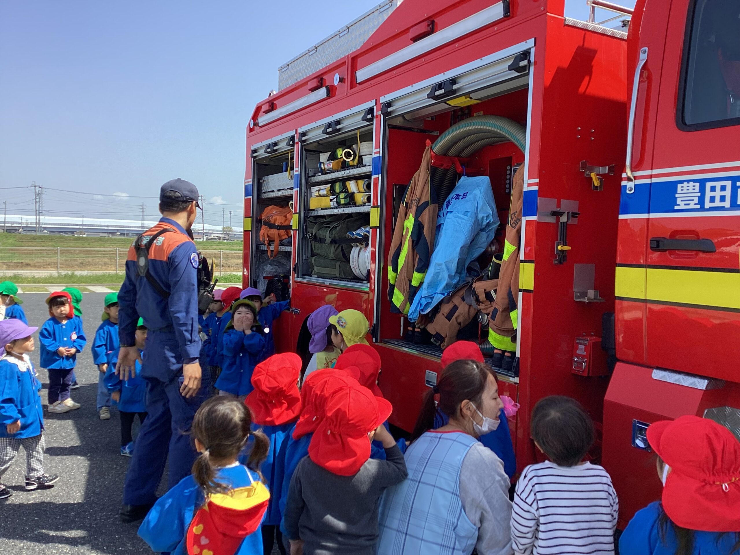 子ども達が外で遊んでいると、「駐車場をお借りします」と突然消防車がやってきました! 近くで見る消防車に、子ども達の目はキラキラ✨ 消防服を触らせてもらったり、消防車の中を見せてもらったりしました