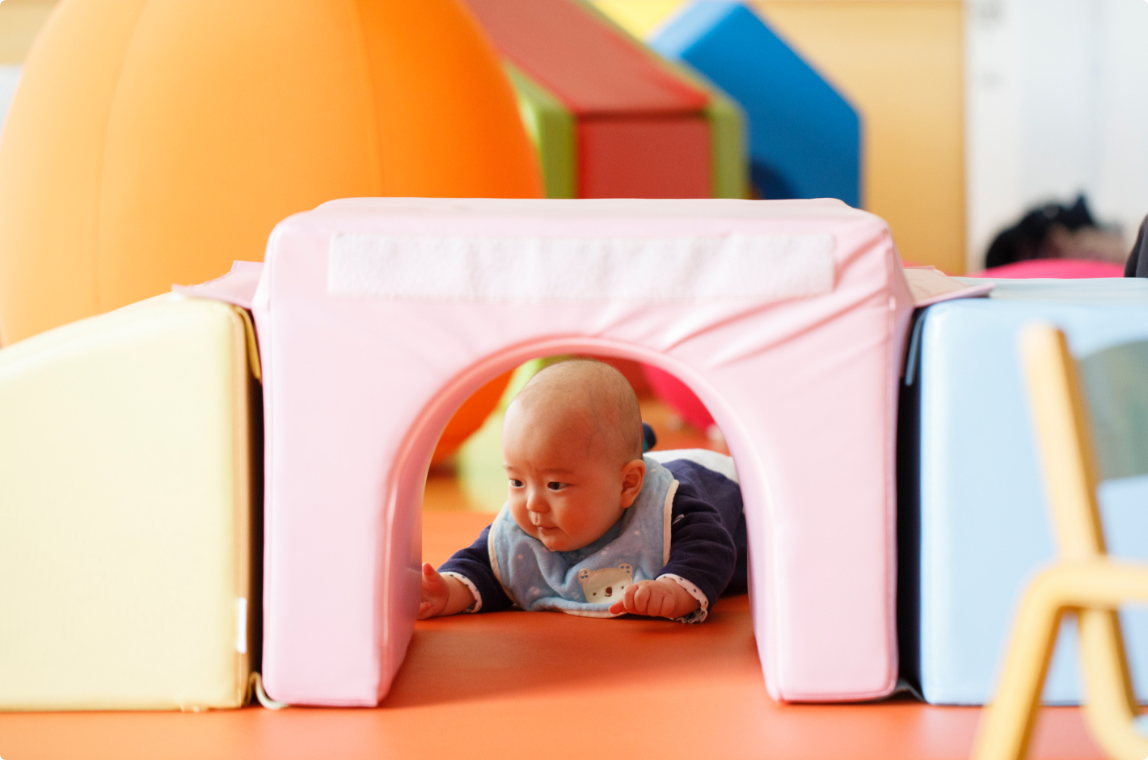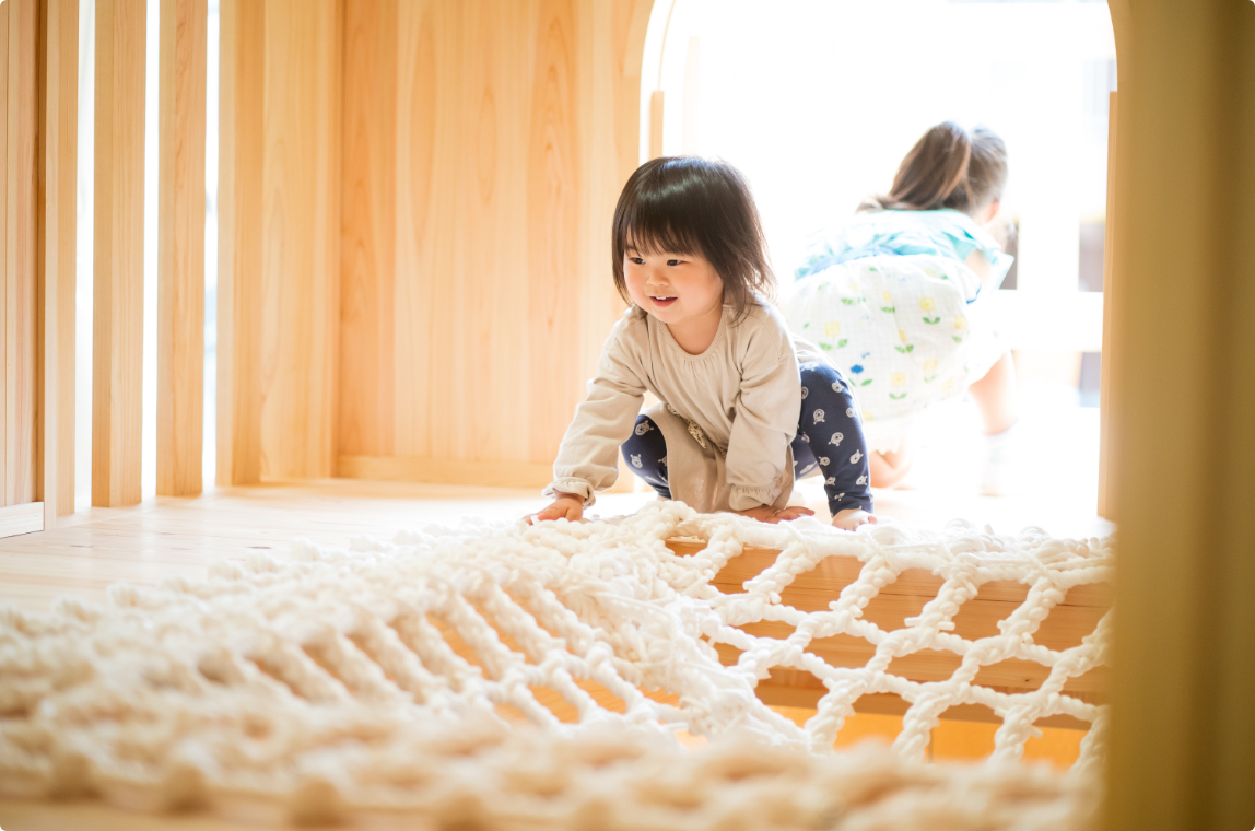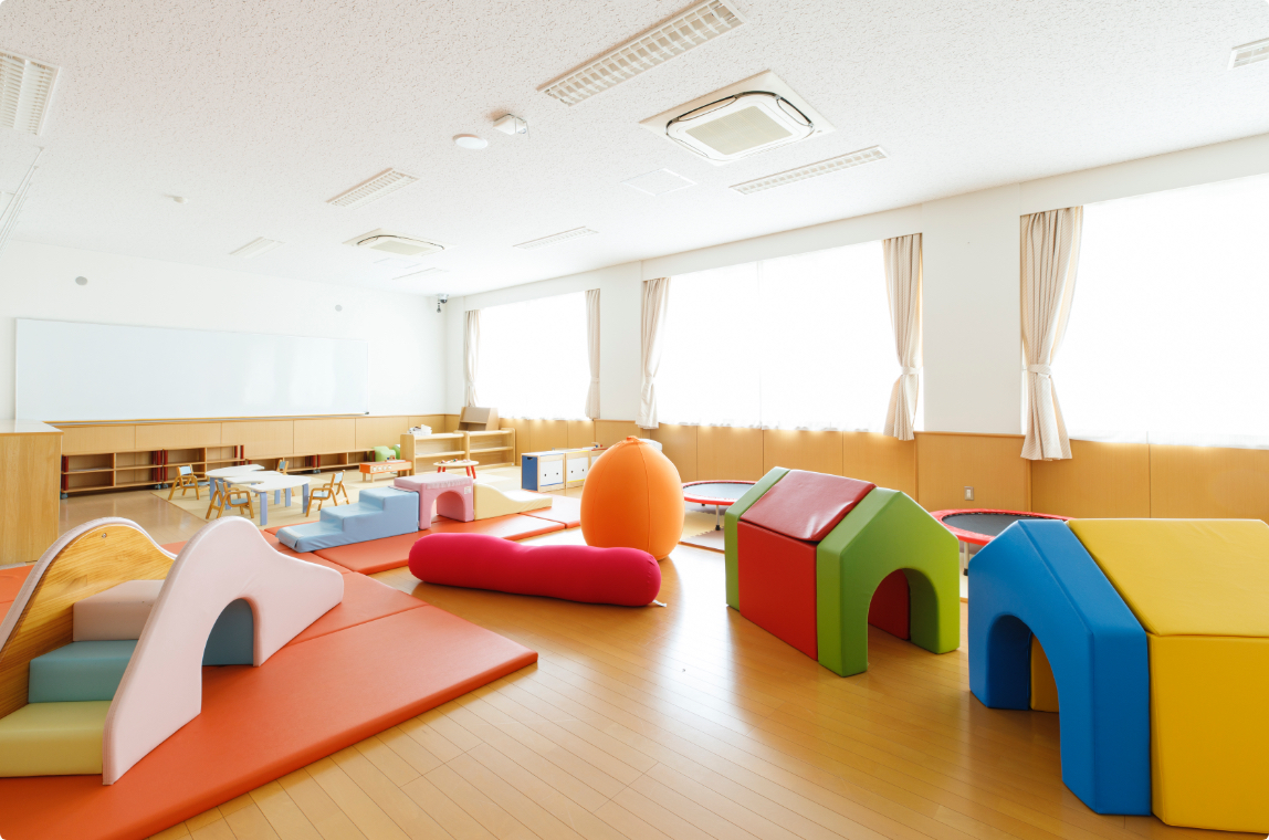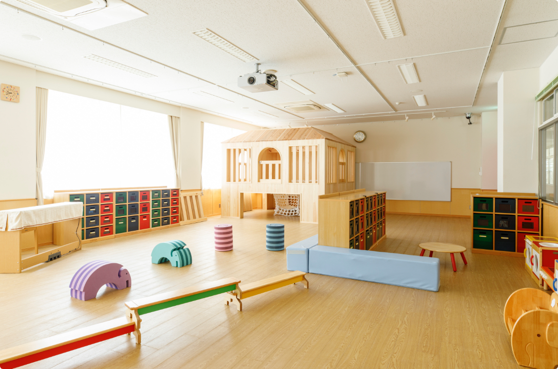 子どもたちが遊ぶことのできる屋内と屋外を結ぶ回遊式の木製遊具を備えた施設です。学生による模擬保育や付属幼稚園児の保育の一環として、この場を利用できます。