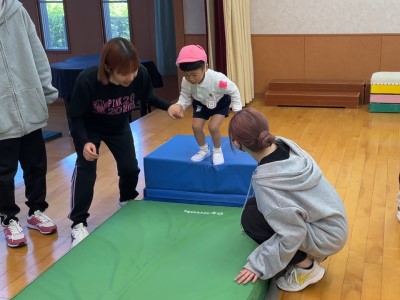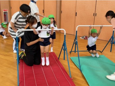 学生は子どもが思わず挑戦したくなる環境を作り、子どものやる気を引き出す声かけ、安心・安全のための補助の方法について実践的に学んでいます。