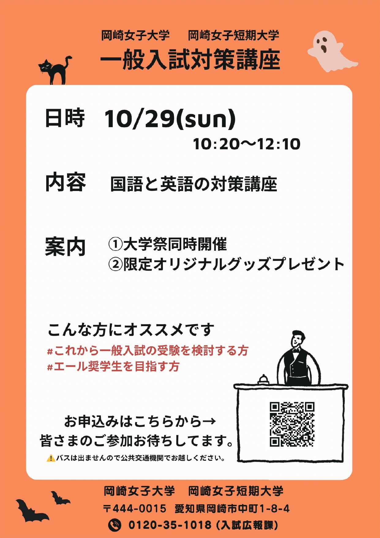 10月29日(日)に「一般入試対策講座」を開催します! 内容は国語と英語の対策講座です! 一般入試の受験を検討している方やエール奨学生を目指す方にオススメです! 丘咲祭(大学祭)と同時開催なので、午後からはおもいっきり楽しめます!! 是非皆様のご参加(ご予約)をお待ちしております。