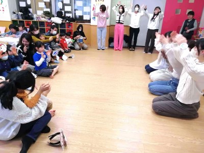 「Five Little Monkeys Jumping on the Bed」は、ペープサートで物語を再現し、「Dear Zoo」ではプレゼントされた動物を想像し、「From Head to Toe」では体を動かしました。