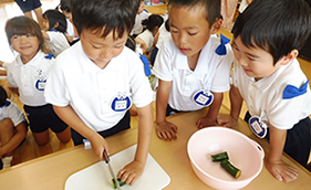 - 園内の畑で、そら豆、玉ねぎ、ミニトマト、きゅうり、さつまいも等の野菜や果物を育て、とれたてのおいしさを味わいます
